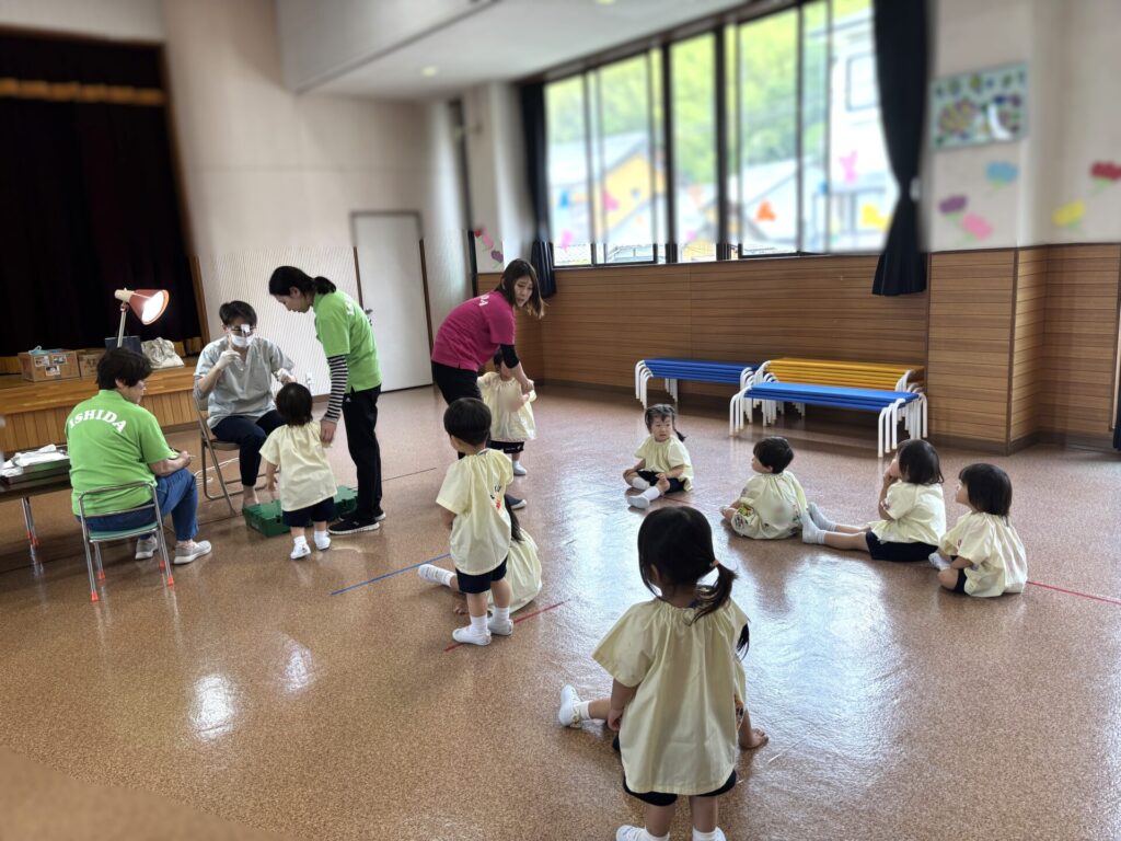 石田幼稚園では毎年健康診断をしています。内科検診は中村医院の中村先生,歯科検診は小原歯科医院の小原先生に来ていただき全学年診察を受けます。年中さん年長さんは視力検査もします。