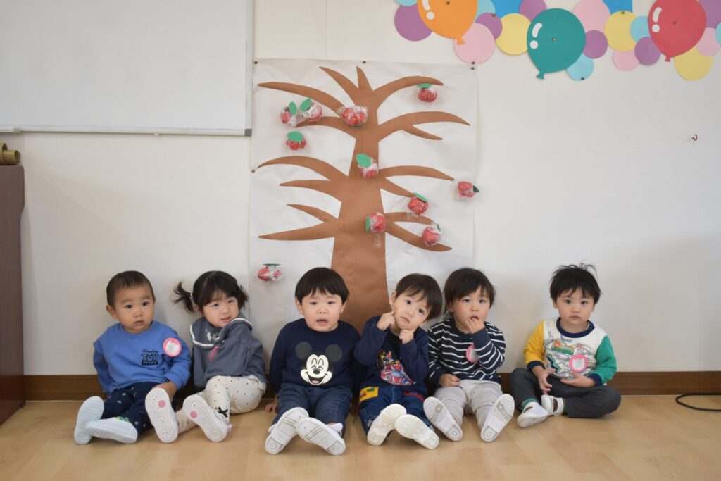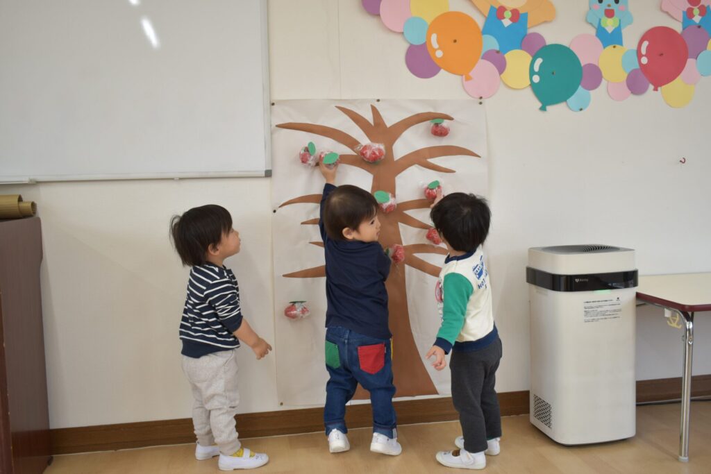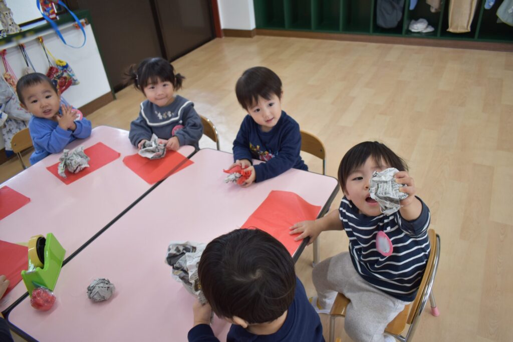この日は新聞紙をくしゃくしゃまるめて・・・赤い薄紙をまいて~。「見て~,りんご!」嬉しい笑顔で教えてくれました。自分でぺったんと貼って美味しそうなリンゴの木。みんなで一緒にはいチーズ♪
