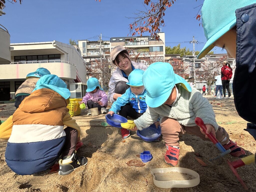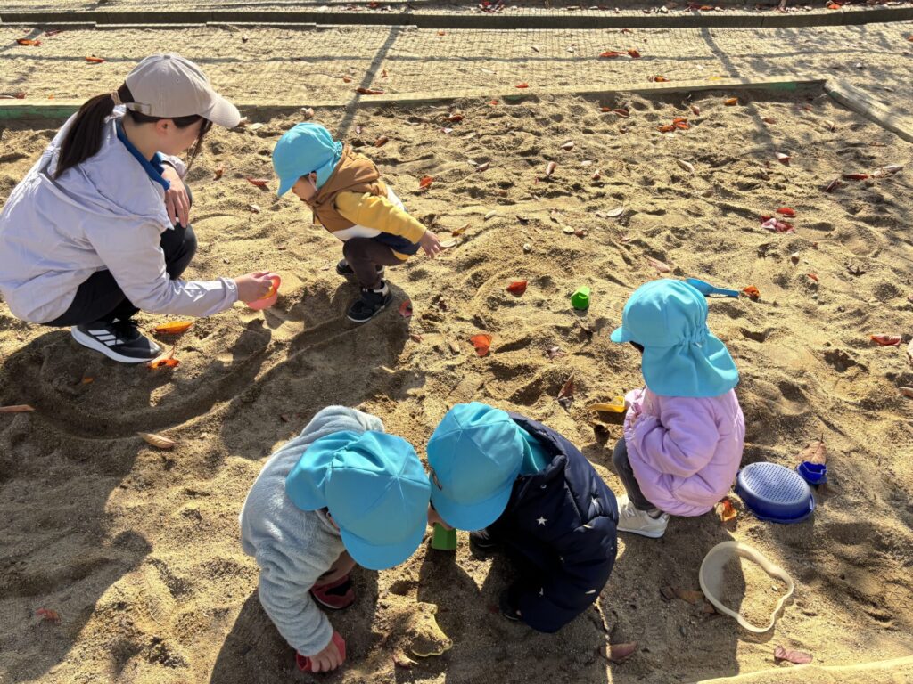 ほし組さんは広い園庭もお気に入り。毎日,園庭に出てブランコに先生と乗ったり,滑り台をしたり,お砂場で遊んだり。