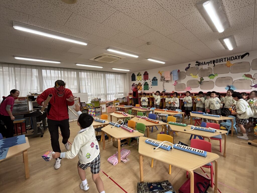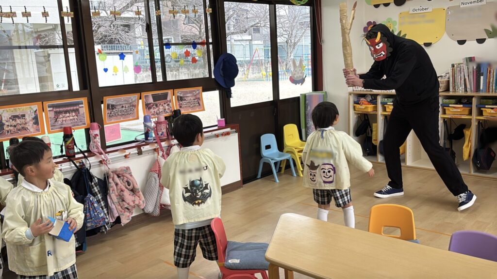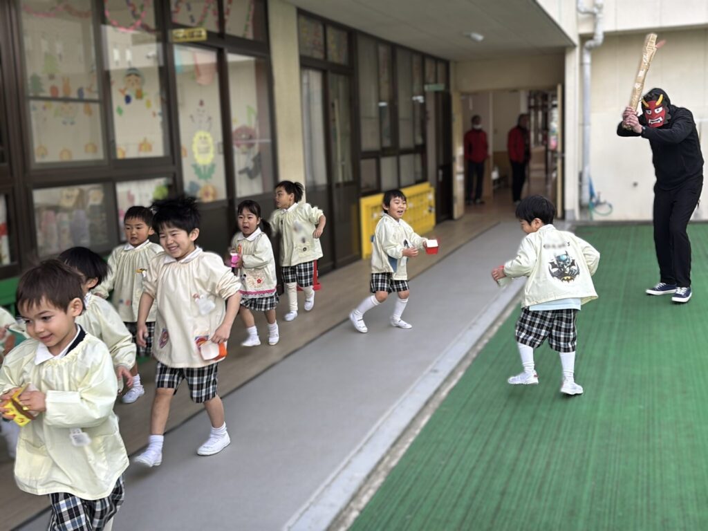 節分の日,幼稚園にも鬼がきました。自分で作った三方を持って鬼退治をがんばりました。みんなの中にいる泣き虫鬼や,怒りんぼ鬼もやっつけてしまいましょう。