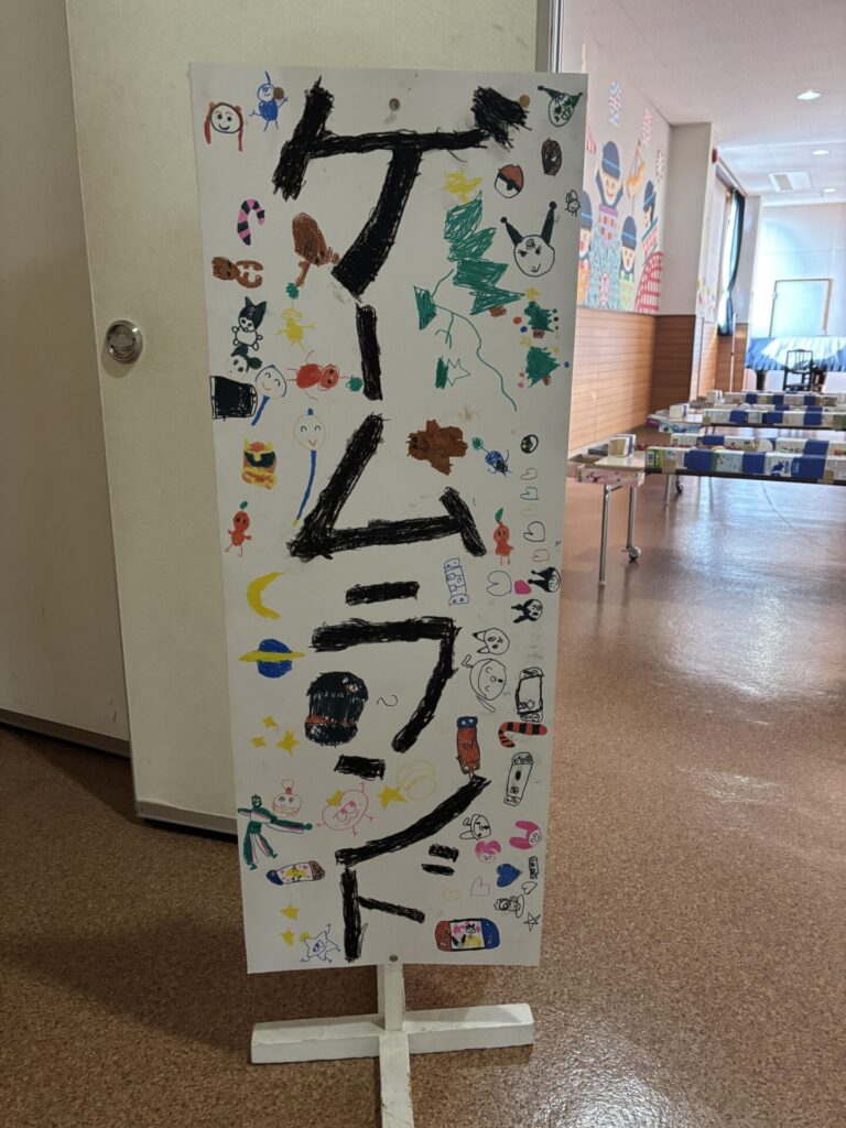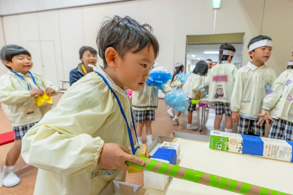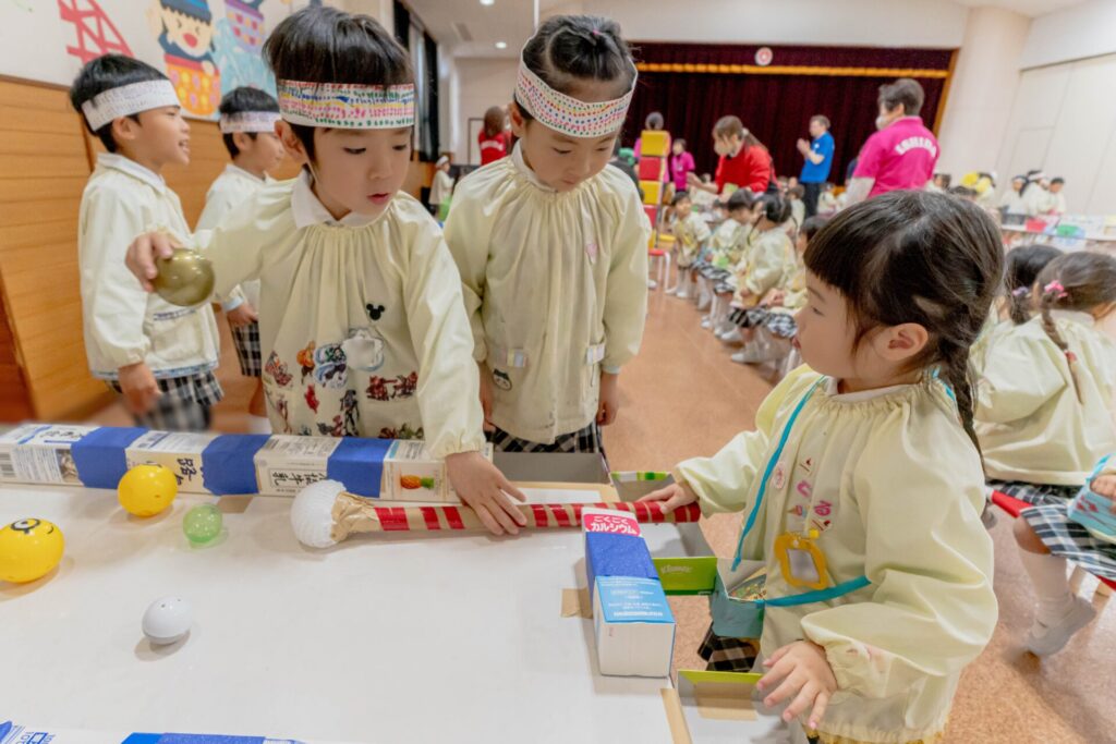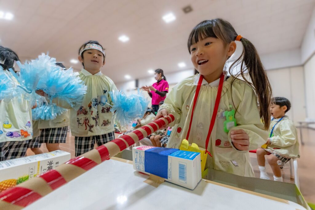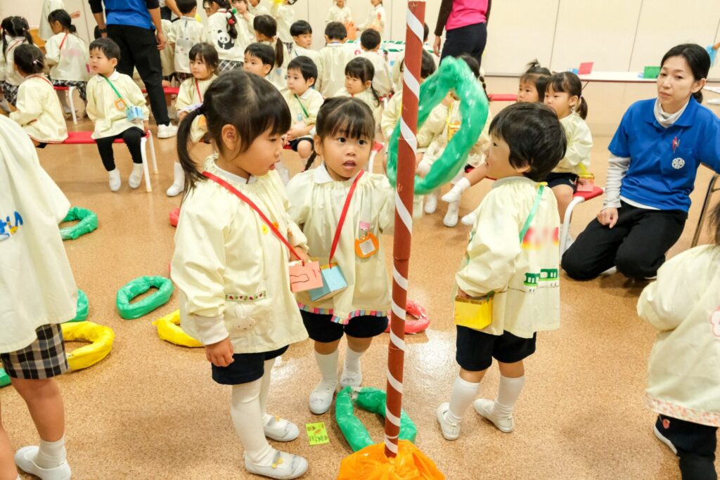 少し前になりますが,年長さんが準備をしてくれたゲームランドがありました。みんな,お手製の紙のお金とお財布をさげて,ゲームランドに出発! 「いくらですか」「20円です」「ありがとうございます。こちらがチケットです」ごっこ遊びが大好きな石田幼稚園のお友だち。上手に受付を終わり,ゲームを楽しみました。