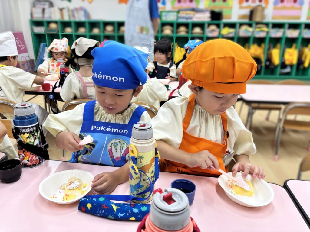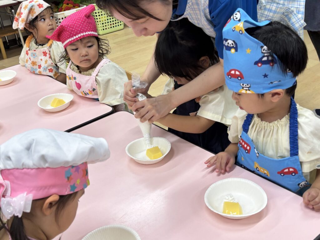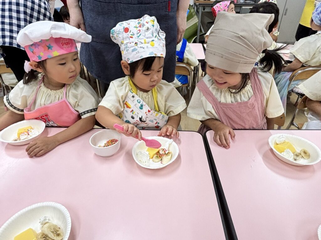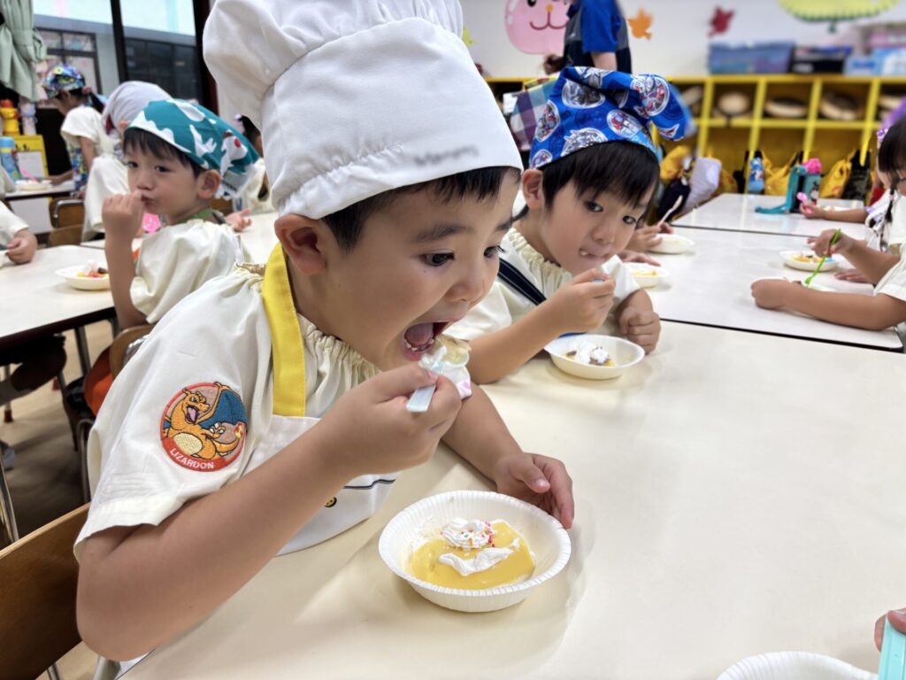ホームクラスで人気の「クッキング」! この日のメニューはプリンアラモード。プリンをお皿に入れてもらい,生クリームにバナナにチョコスプレーをトッピング♪