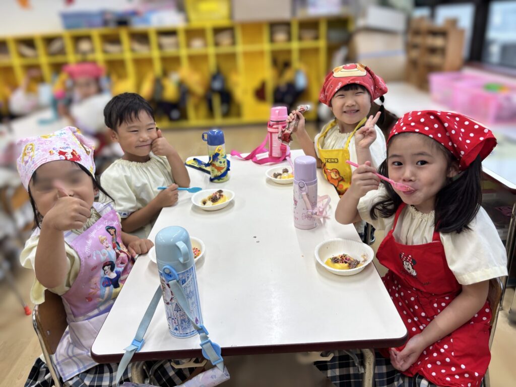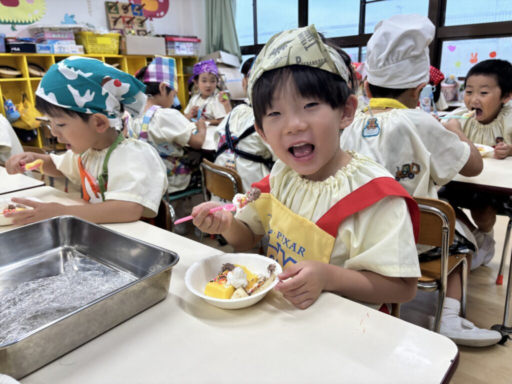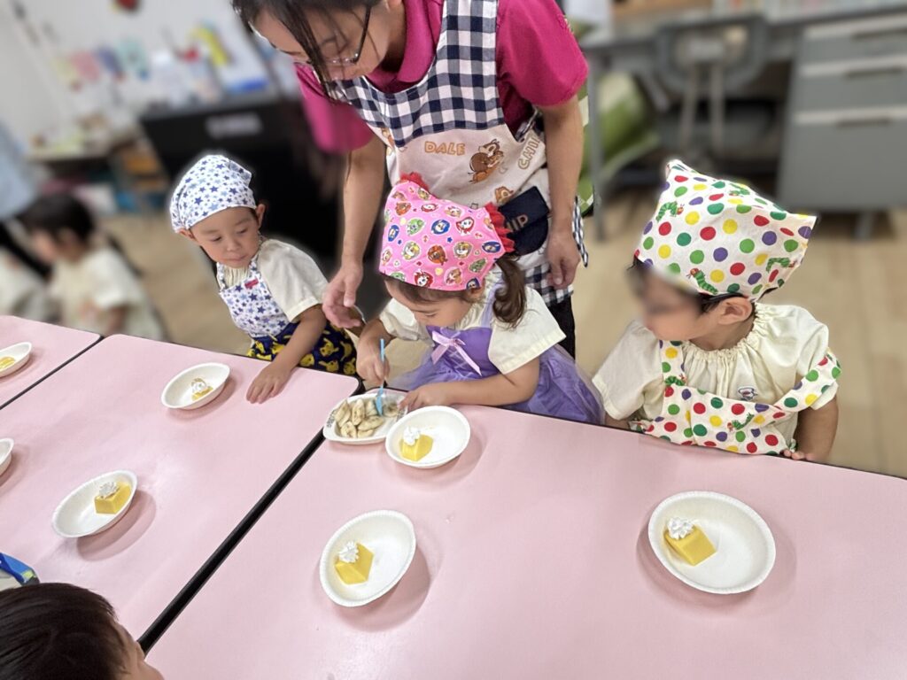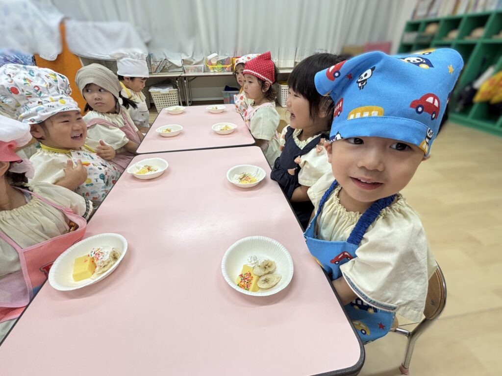 ホームクラスで人気の「クッキング」! この日のメニューはプリンアラモード。プリンをお皿に入れてもらい,生クリームにバナナにチョコスプレーをトッピング♪