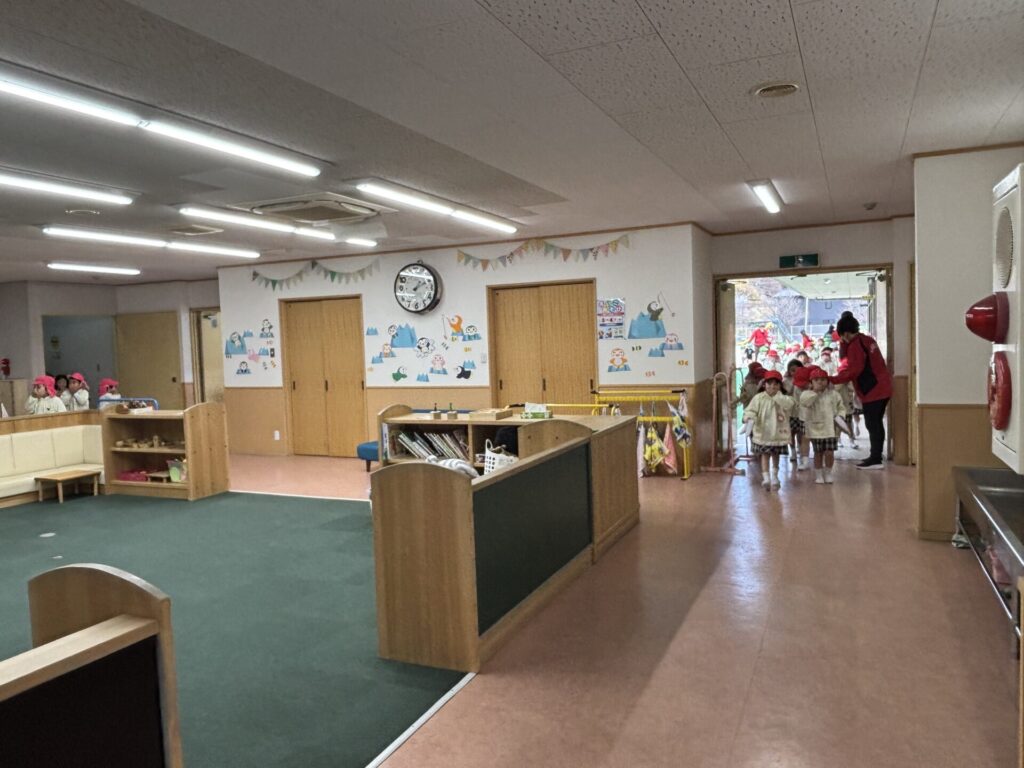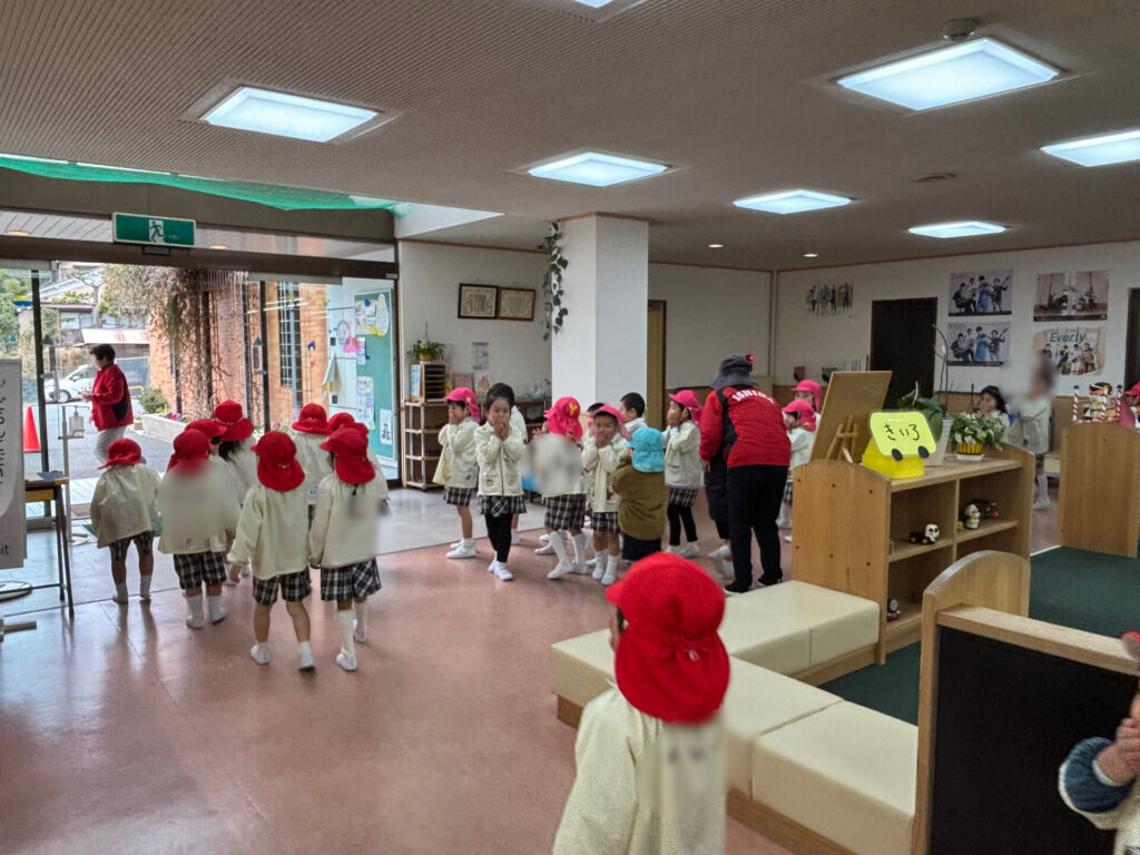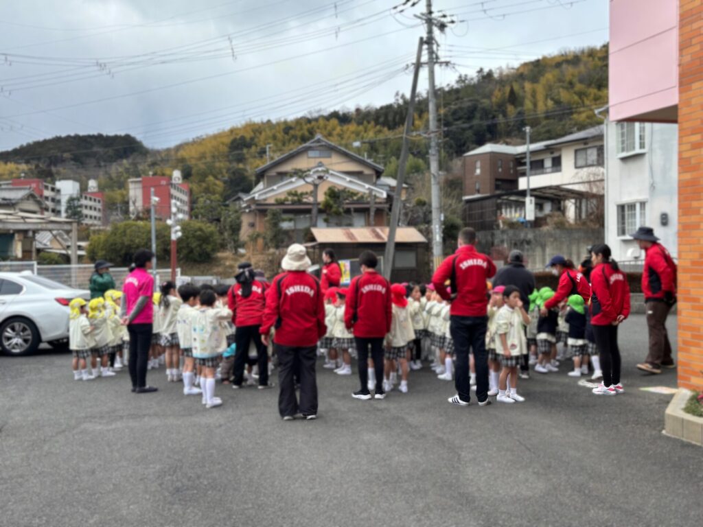 山火事を想定した避難訓練をしました 2025.02.20 園ブログ 山火事発生の合図を聞いて,子どもたちは着の身着のままで急いで玄関前駐車場に集合します。避難訓練は回を重ねるほどに行動が早くなってきています。