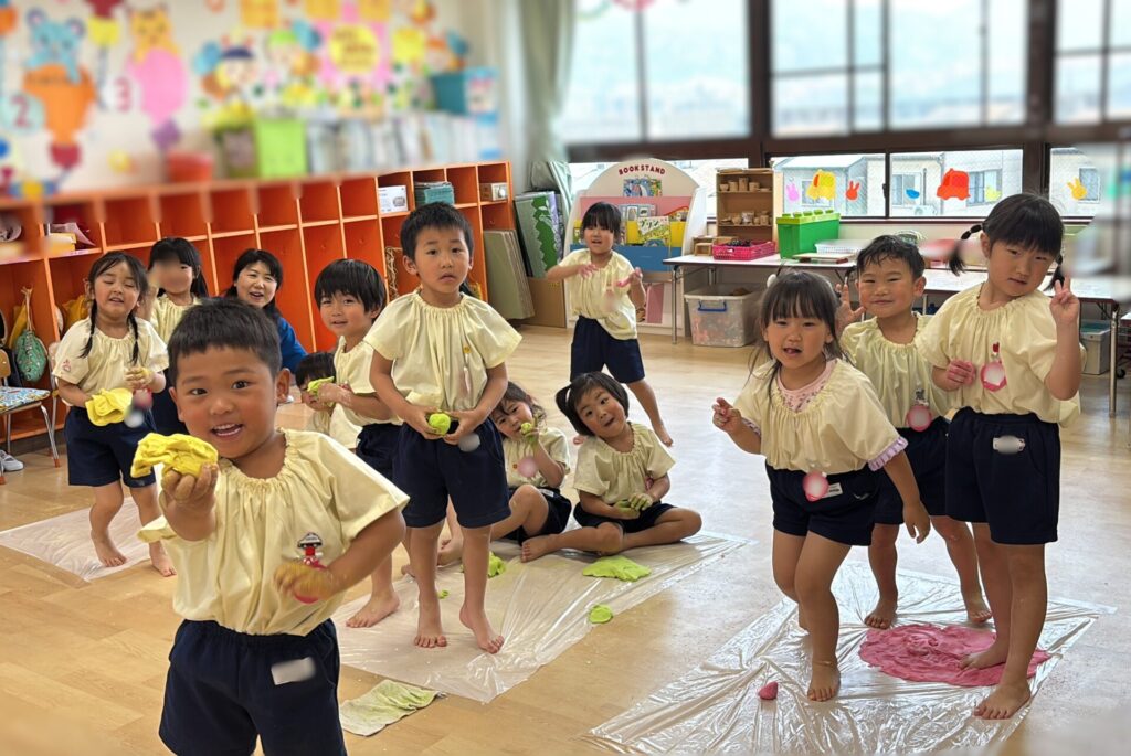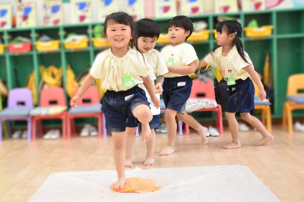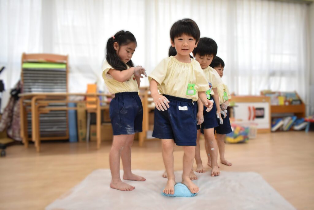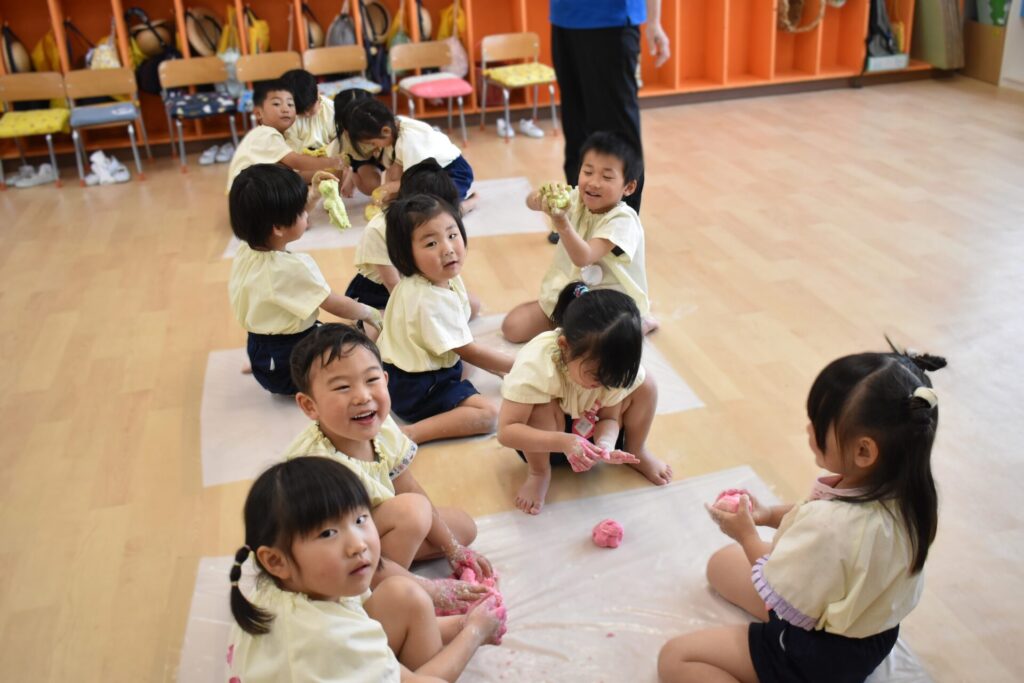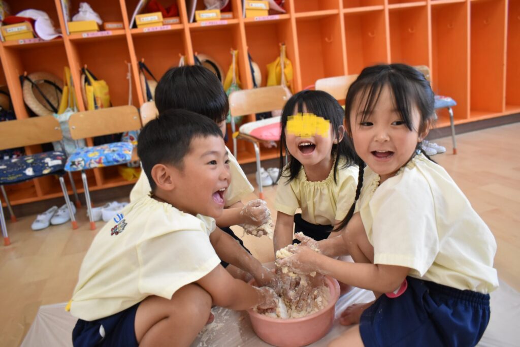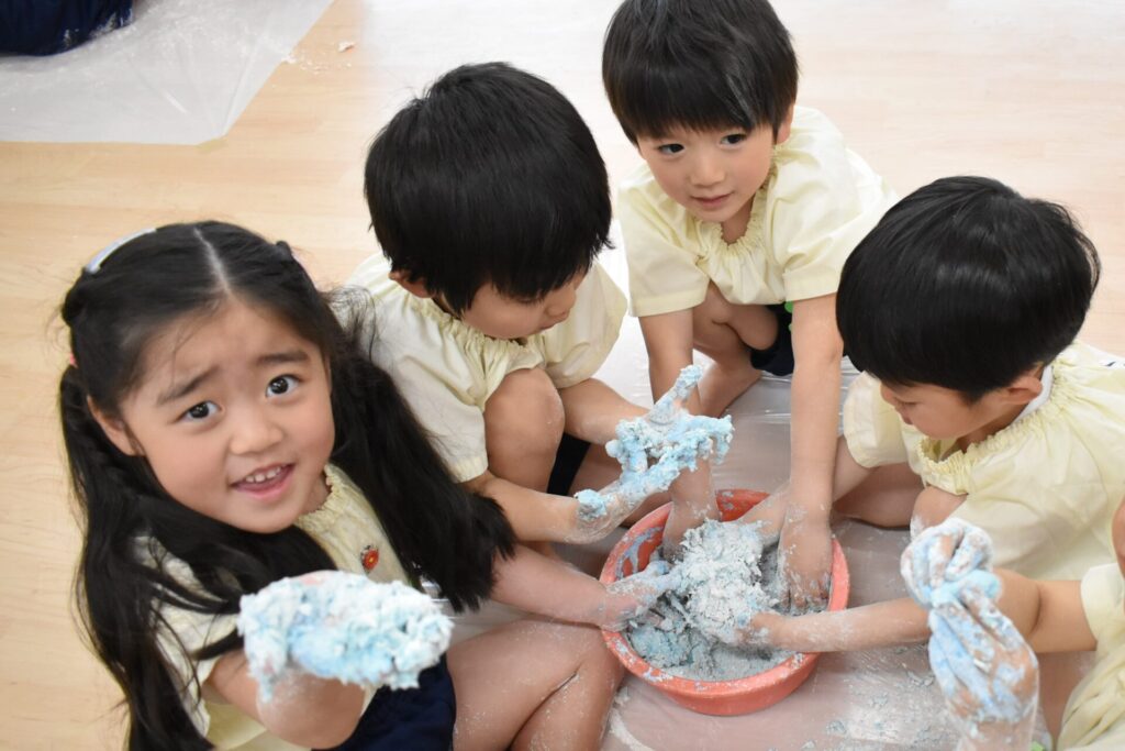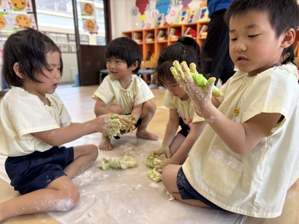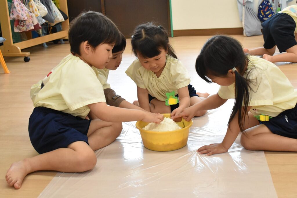 小麦粉粘土を作りました。さらっさらの小麦粉に塩とお水をすこーしたして・・・お友だちと協力して一つになるまで,こねこね。途中のもろもろの感触,もろもろが固まっていく面白さ。最後は足でふみふみ。冷たくて柔らかい小麦粉粘土の踏み心地。どれだけ汚れても大丈夫!