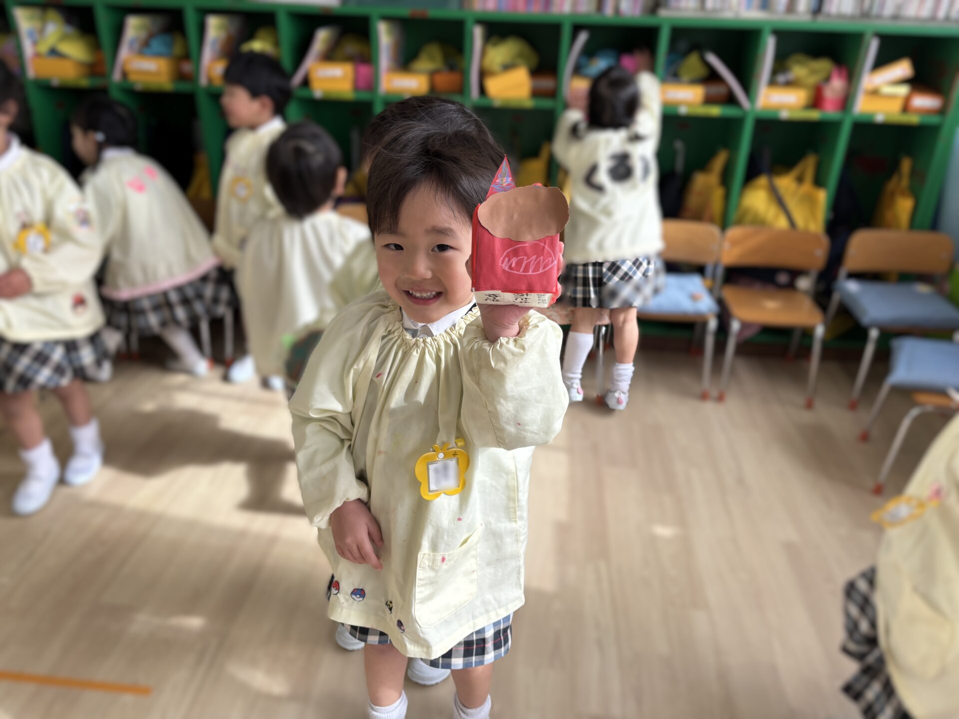節分の日,幼稚園にも鬼がきました。自分で作った三方を持って鬼退治をが…