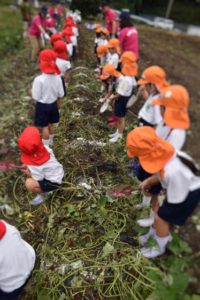 まず芋掘り遠足へいきましたよ。みんなたくさんの大きなお芋を掘りあげることが出来ました。その日,子どもたちのカバンはとっても重たかったことでしょうね!)