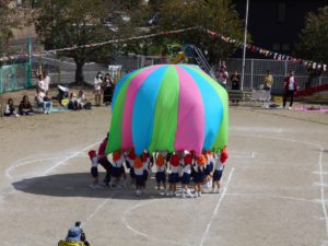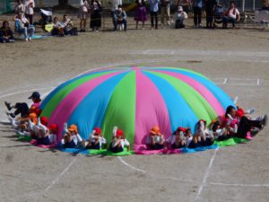 (また,たくさん運動会の練習も頑張りました。パラバルーンの演技は,みんなが力を出し切り,本当に素晴らしかったと思います。)