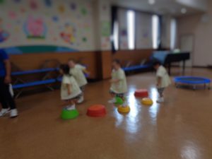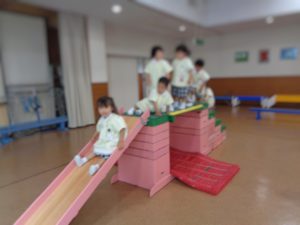 (梅雨になり,自由遊びも園庭から室内へとゆっくり変わってきています。室内遊びよりも,広い場所でいろんなことが楽しめる外遊びの方が楽しいことは否定できません。そこで,みんなが楽しめる“室内の遊び場”を遊戯室に作りました。そこには,トランポリンや巧技台の橋,飛び石コース,そして一番楽しい滑り台があります。