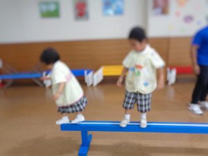 Rainy season is here and free playtime is slowly shifting from outdoors to indoors. It is undeniable that playing outside is more fun than playing inside. There is more space and more fun things to do. But no rain can stop us from having fun. So we have decided to set up an “indoor playground” in the hall. This playground includes a trampoline, a wooden bridge, a stepping stone course, and the most fun thing of all, an indoor slide.