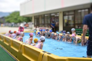(暑い日が続き始めましたね。6月下旬から,石田幼稚園ではプール遊びが始まりました。プールの冷たいお水の中で楽しい動きをたくさんしたり,プール遊びの後半は,ボトルやカップを使って,遊んでいます。たくさんのボトルやカップを持ってきてくださり,ありがとうございました。子どもたちはプールをとても楽しみにしているので、プール予定の日はどうか雨が降りませんように!)