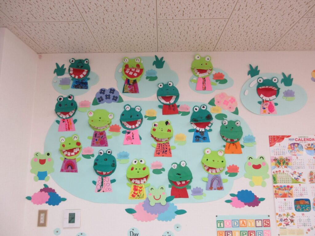 We turned the wall of our classroom into a cheerful frog pond! We carefully cut out shapes, glued them together, and gave our frogs adorable faces and colorful shirt designs.